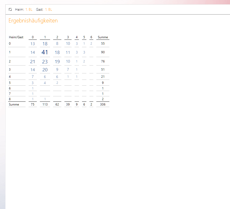 Somit hat die Analyse nur eine einzige Grafische Tabelle benötigt. Allerdings ist in dieser Grafischen Tabelle nicht von vornherein klar, dass das häufigste Spielergebnis mit einer konkret genannten Mannschaft zum häufigsten Spielergebnis ohne konkret genannte Mannschaften gehört. Es könnte sein, dass es eine Heimmannschaft (oder Gastmannschaft) gibt, die beispielsweise 10-mal 0:0 gespielt hat.
