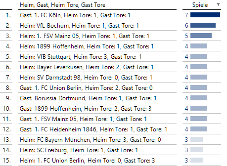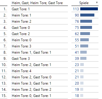 Hier sehen wir nur 1er- und 2er-Tupel mit den Toren der Heim- bzw. Gastmannschaft, da ja die Erwähnung einer konkreten Heim- bzw. Gastmannschaft nur noch zu maximal 17 Spielen führen kann, also weniger als die hier sichtbaren 18 auf dem 15. Platz.