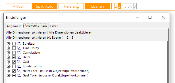 In der Magic-Button-Leiste sind einerseits jetzt nur noch 3er-Tupel aktiviert. Darüber hinaus müssen Heim-Tore und Gast-Tore nun zwingend im 3er-Tupel vorhanden sein (muss in Objekttupel vorkommen durch Rechts-Klick aktivierbar).