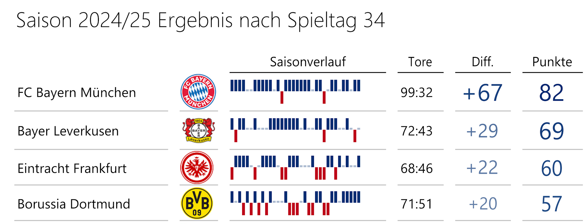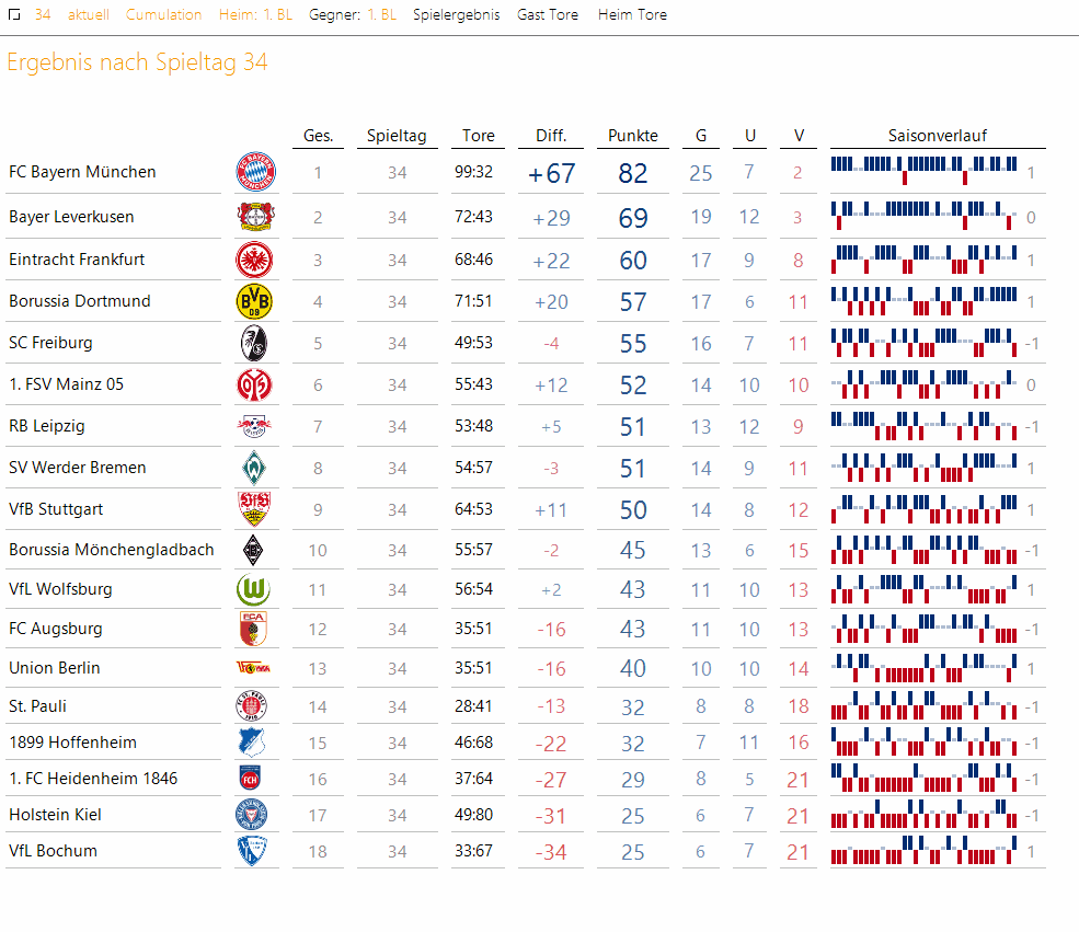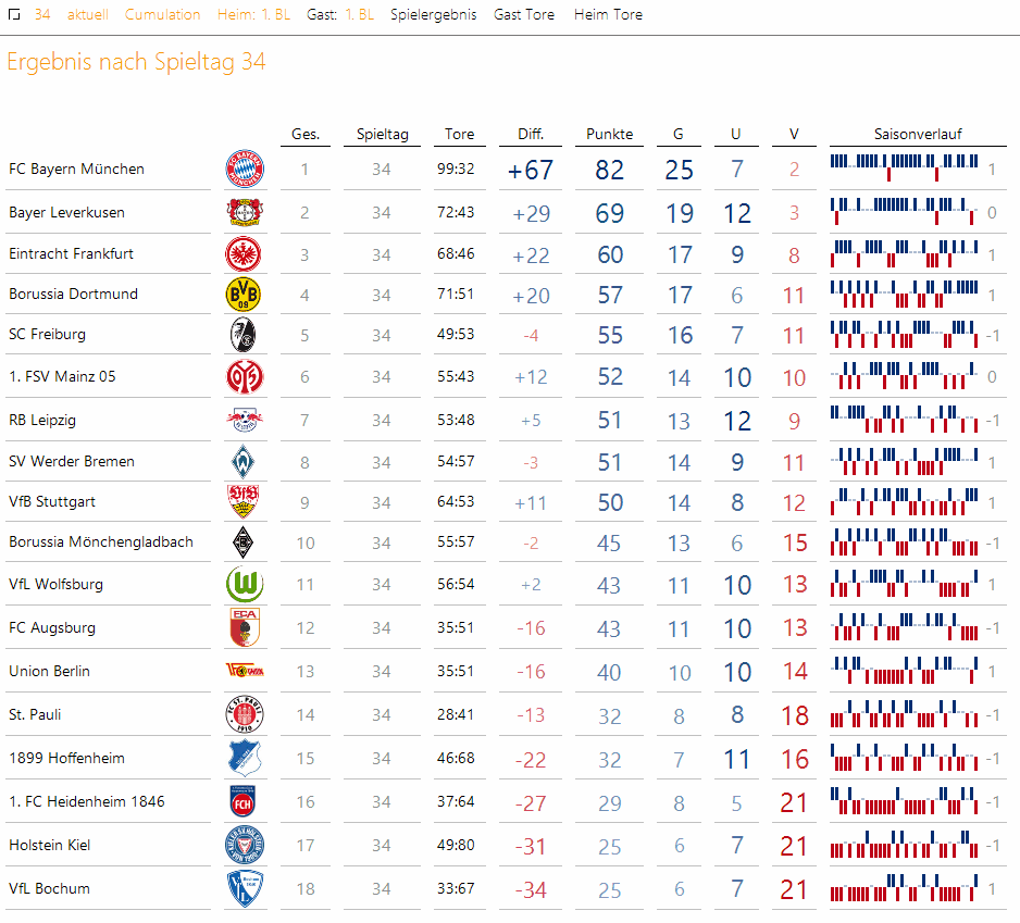 Die Spielergebnisse der gerade abgelaufenen Bundesligasaison 2024/25 finden wir bei der offiziellen Seite www.bundesliga.com oder beim kicker. Keine Grafische Tabelle hat innerhalb und außerhalb unserer Company dermaßen viele Fans wie die mit unserer Business-Intellligence-Software DeltaMaster erzeugte Abschlusstabelle. Warum? Nahezu alle interessanten Größen sind auf kleinem Raum leicht ablesbar!