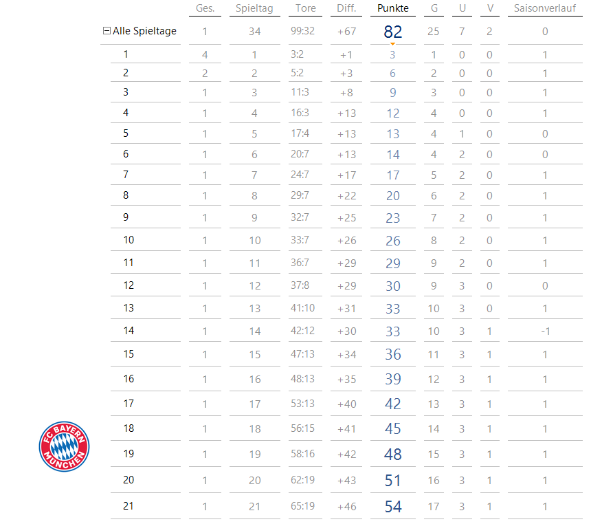 Somit können Sie für jede Mannschaft den kompletten Saisonverlauf nachverfolgen. Im Navigationsschritt beim FC Bayern München ist beispielsweise erkennbar, dass die schlechteste Platzierung der 4. Platz am 1. Spieltag war: