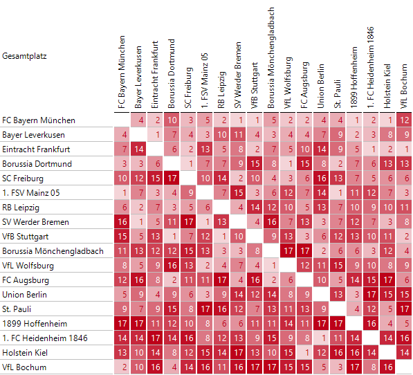 Eigentlich wollte ich ja bei der Bundesliga-Abschlusstabelle bleiben, aber jetzt interessiert mich doch eine Darstellung, wie die einzelnen Mannschaften miteinander zurechtkommen. Dazu verwende ich die jeweiligen Platzierungen der Mannschaften der Zeilen, wenn wir nur die beiden Spielpaarungen gegen die Mannschaft einer Spalte betrachten: