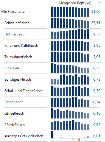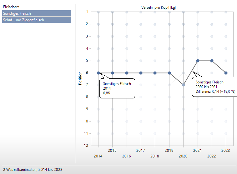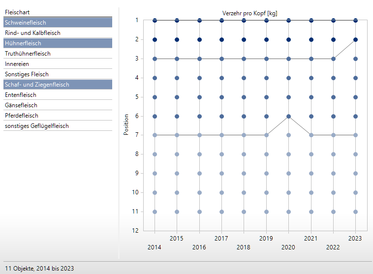 Die Fleischarten stehen dabei links in derjenigen Reihenfolge aufgelistet, die sich aus der Rangfolge des Verzehrs in der ersten Periode ergibt. In unserem Beispiel ist die Periode links auf 2014 eingestellt: