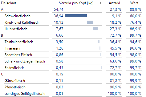 Mit Blick auf die oben gezeigte ABC-Analyse folgern wir, dass nun im Jahr 2014 die A-Klasse nur noch Schweinefleisch und „Rind- und Kalbfleisch“ enthalten wird, die B-Klasse somit mit Hühnerfleisch beginnt und die C-Klasse mit Schaf- und Ziegenfleisch. Die jeweils ersten Elemente jeder Klasse haben wir in der Bewegungsanalyse markiert: