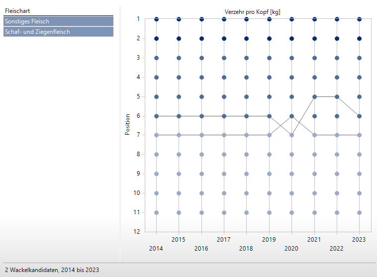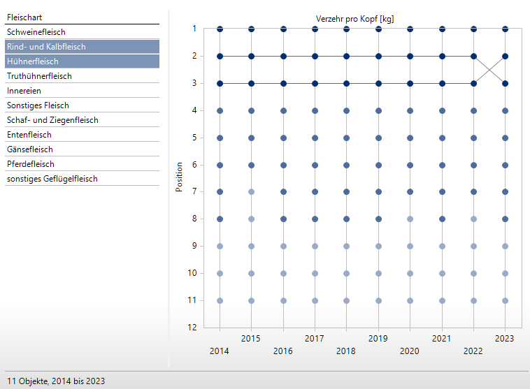 „Rind- und Kalbfleisch“ und Hühnerfleisch haben wir in der Liste markiert, und wir sehen die Ränge im Zeitverlauf als Linienzüge. Hühnerfleisch hält zunächst stabil den Rang 3, aber im Jahr 2023 – wie bereits bei der dynamischen Portfolioanalyse beobachtet – tauschen Rind und Huhn schließlich die Plätze.