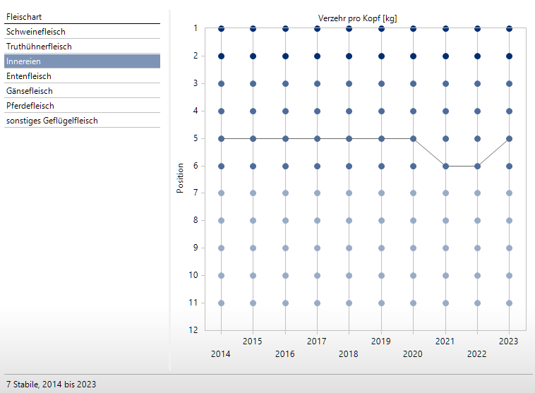 Zum Beispiel war Schweinefleisch immer auf dem ersten Rang und somit ständig in der A-Klasse anzutreffen. Die in der Grafik ausgewählten Innereien wechseln zwar von Platz 5 auf 6 und zurück, aber diese Änderungen finden innerhalb der Klasse B statt: Somit liegt ein stabiles Element vor.