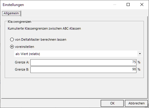 Mit diesen Einstellungen versucht DeltaMaster, die kumulierten Anteile so dicht wie möglich an 75 % (für A) bzw. 98 % (für A und B) zu legen. Die Grenzen müssen dabei nicht übertroffen werden, es zählt nur der minimale Abstand.