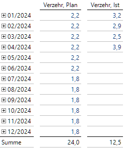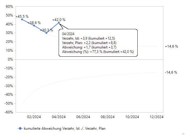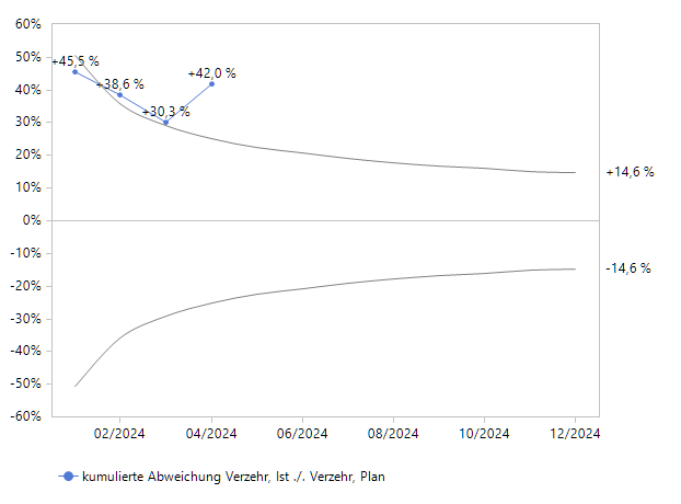 In der vorliegenden Situation, in der wir uns bereits Ende April außerhalb des Trompetentrichters befinden, landen wir am Jahresende deutlich außerhalb des gewünschten Bereichs. Bis einschließlich Juni 2024 verbleiben wir bei den 42,0 %, aber ab Juli erhöht sich die relative Abweichung für die kumulierten Werte, da ja ab dann im einzelnen Monat eine relative Abweichung von 51,4 % vorliegt.
