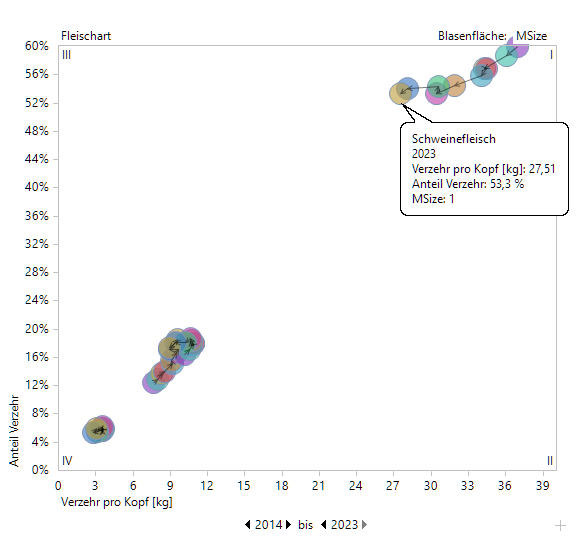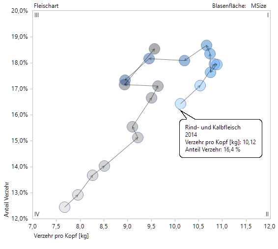 Im vorliegenden Beispiel habe ich in den Eigenschaften die Punktfärbung nach Perioden gewählt: Jedes Jahr erhält dadurch eine individuelle Farbe. Bei Schweinefleisch reduziert sich zunächst die absolute Menge und der Anteil. Dies bedeutet, dass der Verzehr von Schweinefleisch stärker sinkt als der restliche Verzehr. Später sinkt der Verzehr von Schweinefleisch weiter, aber der Anteil bleibt eher konstant. Dies deutet darauf hin, dass sich auch der restliche Verzehr proportional zu Schwein verringert.