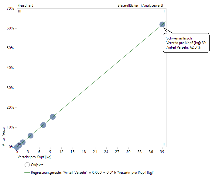 Da sich der Verzehr der einzelnen Fleischarten ändert, wäre es interessant zu untersuchen, wie sich der Anteil am Gesamtverzehr pro Kopf im Laufe der Zeit verschiebt. Die dynamische Portfolioanalyse ist mit dem aktuellen DeltaMaster-Release 6.5.7 in den Kanon der Analyseverfahren aufgenommen worden.