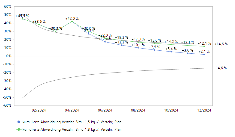 Höhere Relevanz in unserem Fall hat die zweite Art der Projektion – die Projektion mit originären Planwerten. Wie wird sich die relative Abweichung der kumulierten Istwerte zu den kumulierten Planwerten entwickeln, wenn wir uns von nun exakt an den Plan halten? Esse ich ab Mai 2024 genau 2,2 kg und ab Juli 1,8 kg Schweinefleisch pro Monat, wie sieht dann die Entwicklung aus?