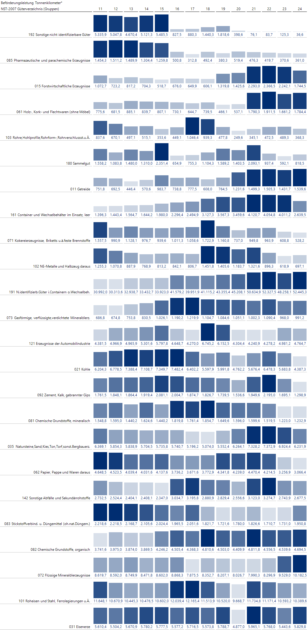 Dadurch kann man die Zeilenachse der Gruppen der Güterverkehrsstatistik nach dem Variationskoeffizienten sortieren, obwohl die Jahre auf der Spaltenachse liegen: