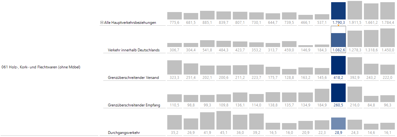 Für jeden dieser Werte können wir in die andere Dimension der Hauptverkehrsbeziehungen navigieren – auch gleichzeitig – und sehen, dass jeweils der Verkehr rein innerhalb Deutschlands mit Abstand auf dem ersten und der Durchgangsverkehr auf dem letzten Platz liegt.