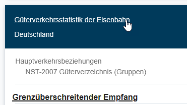 Die Daten sind unter 46131-0005 – Beförderte Güter, Beförderungsleistung (Eisenbahngüterverkehr): Deutschland, Jahre, Hauptverkehrsbeziehungen, Gütergruppen zu finden.