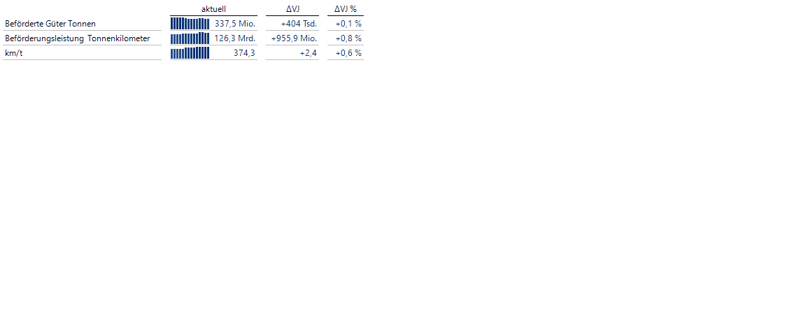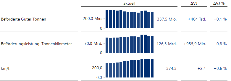 Aus Entlastungsgründen sind zur monatlichen Erhebung nur Unternehmen auskunftspflichtig, die im Vorjahr eine Beförderungsleistung von mindestens 10 Millionen Tonnenkilometer insgesamt oder 1 Million Tonnenkilometer im Kombinierten Verkehr (Eisenbahn + 1 weitere Transportart) erbracht haben (Quelle: Allgemeine Angaben zur Statistik des Datensatzes 46131-0005). Etwa 90 % der tatsächlichen Summen werden mit diesem Vorgehen erfasst.