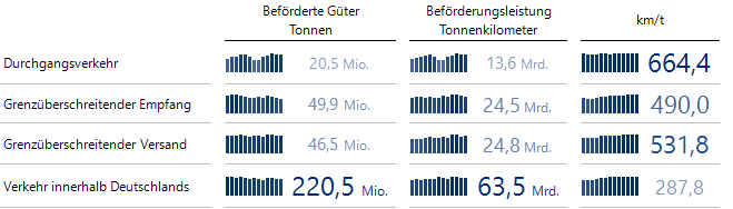 Bei den Kilometern pro Tonne sieht man die ohne weitere Vorkenntnisse erwartete Reihenfolge: Beim Durchgangsverkehr legt ein Gut innerhalb Deutschlands eine längere Strecke zurück als beim Verkehr innerhalb Deutschlands. Die meisten Tonnen und Tonnenkilometer kommen beim Verkehr innerhalb Deutschlands zustande.