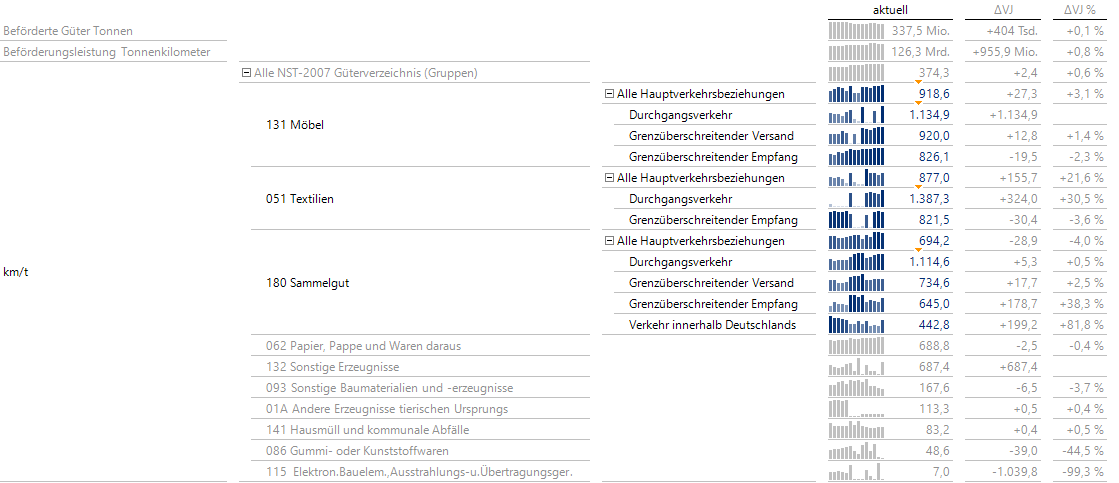 Auf den ersten drei Plätzen liegen hier 131 Möbel, 051 Textilien und 180 Sammelgut, wobei zum Beispiel Textilien erstaunliche 1387,3 km im Durchgangsverkehr zurücklegen. Auffallend ist auch, dass bei 131 Möbel kein rein innerdeutscher Verkehr genannt wird.