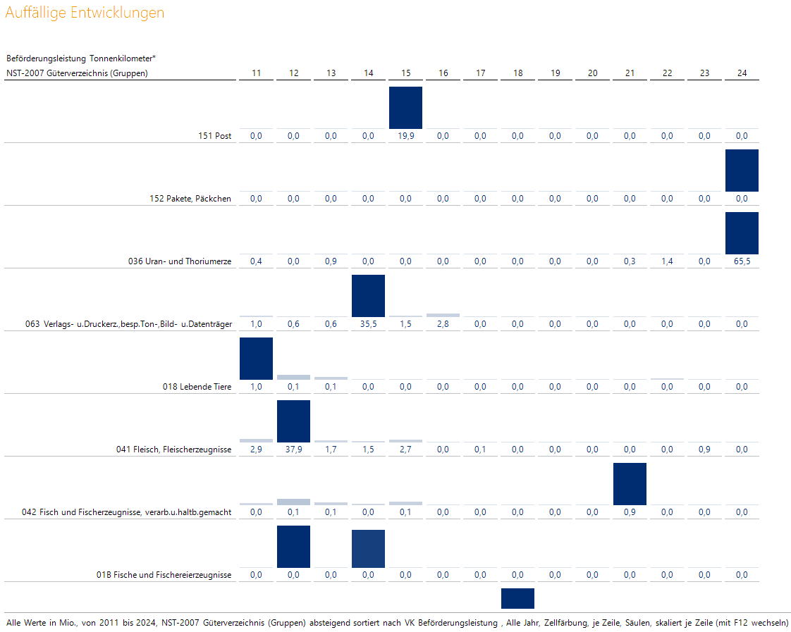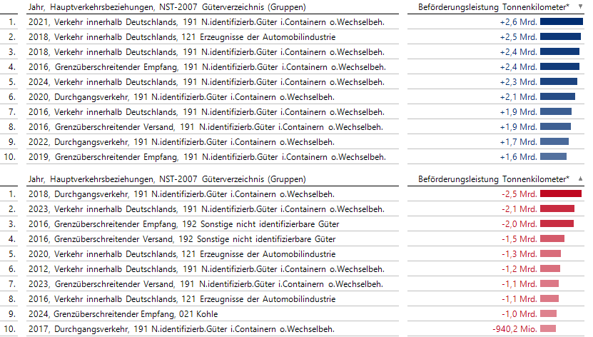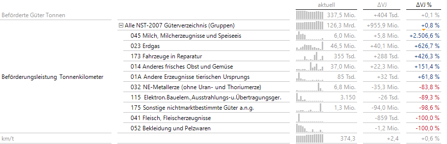 Kommen wir zur relativen Änderung der Beförderungsleistung in Tonnenkilometern gegenüber dem Vorjahr. Die Navigation in die Ebene der Güter zeigt massive relative Änderungen – nach oben und nach unten. Nach unten sind die Werte durch -100 % begrenzt, aber nach oben können nahezu beliebig hohe relative Abweichungn auftreten: