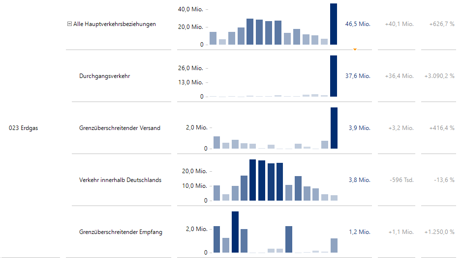 Wie man sieht, wird dieser Peak hauptsächlich durch einen bisher einmaligen Anstieg beim Durchgangsverkehr erzeugt. Beim Verkehr innerhalb Deutschlands nehmen die Tonnenkilometer bei Erdgas sogar ab.
