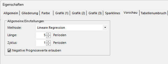 In DeltaMaster aktivieren wir im Menü rechts unter dem Punkt Sparklines die Vorschauwerte und stellen unter Eigenschaften, Reiter Vorschau, die Methode lineare Regression und eine (Vorschau-) Länge von 5 Perioden ein, während Zyklus auf dem Wert 1 verbleibt:
