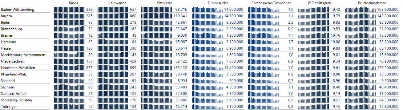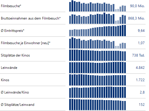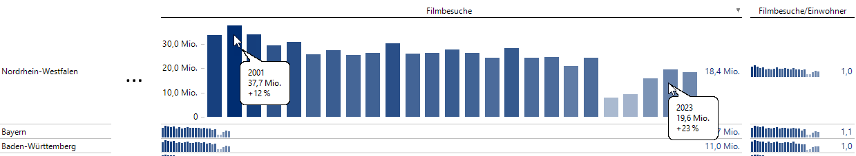 In obiger Tabelle zeigen die Sparklines die langfristige Entwicklung von 2000 bis 2024. Schon in dieser Grafischen Tabelle fällt der Einbruch bei den Kinobesuchen während der Corona-Pandemie auf.