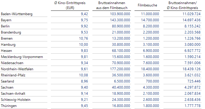 Die Anzahl der Filmbesuche ist auf Hunderttausender gerundet. Filmbesuche je Einwohner liegen mit 1 Stelle hinter dem Komma vor, der durchschnittliche Kino-Eintrittspreis ist centgenau angegeben und die Bruttoeinnahmen aus dem Filmbesuch sind auf Hunderttausender [diesmal in Euro] gerundet.