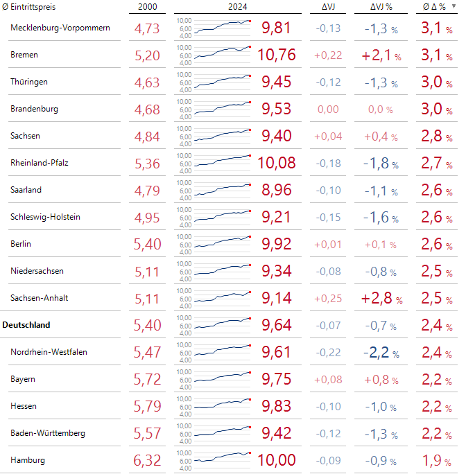 In der folgenden Grafischen Tabelle sind die wichtigsten Entwicklungen der durchschnittlichen Eintrittspreise der Bundesländer zusammengefasst: