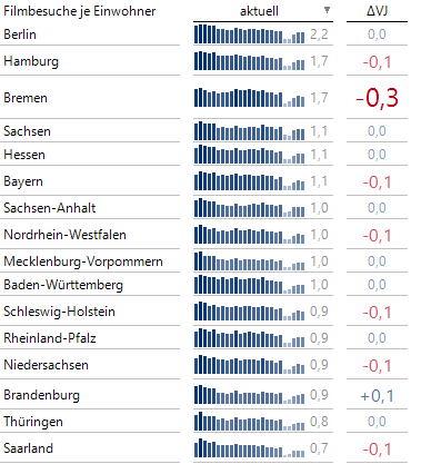 Nun habe ich aber den Vorteil, dass auch für Deutschland bzw. eine Auswahl von Bundesländern der gesuchte Ausdruck Filmbesuche je Einwohner [neu] zur Verfügung steht, auch wenn er nicht die maximal mögliche Genauigkeit aufweisen mag.