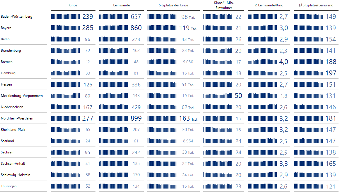 Beispielsweise fällt bei den Kinoanzahlen Mecklenburg-Vorpommern im Jahr 2019 mit einem Sprung nach oben auf. Gleichzeitig besitzt Mecklenburg-Vorpommern nun mit (geschätzten) 50 Kinos pro 1 Million Einwohner die höchste Kinodichte. Die Sitze pro Leinwand haben stetig abgenommen.
