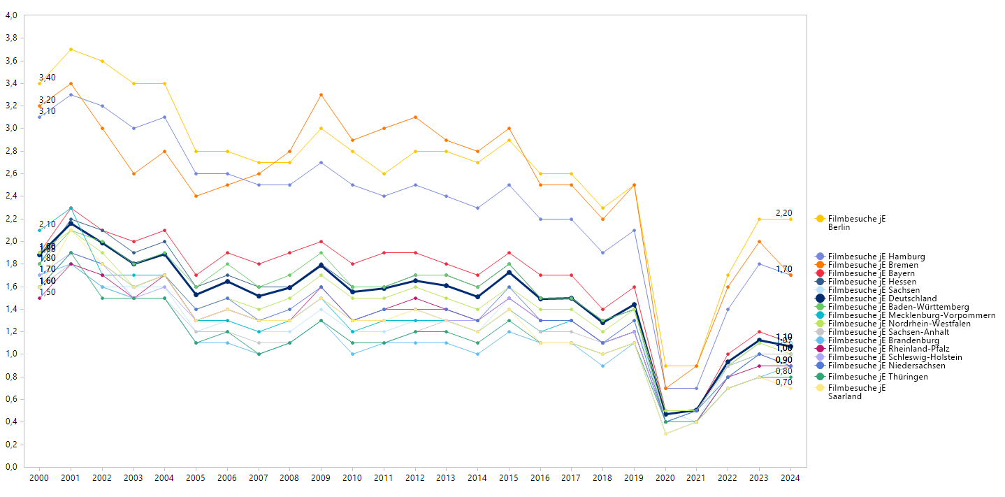 Bis zum Vorjahr 2023 mit 19,6 Mio. Filmbesuchen hatten sich die Zahlen seit dem Einbruch 2020 wieder stetig erholt, aber im letzten Jahr gab es wiederum einen weiteren Rückgang um 6,1 % auf nunmehr 18,4 Mio. Vergleicht man diesen Wert mit den 37,7 Mio. Filmbesuchen aus dem Jahr 2001, haben sich die Zahlen halbiert.