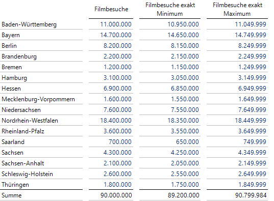 Beispielsweise war bei Saarland mit der Angabe 700.000 zunächst klar, dass die exakte Zahl der Filmbesuche zwischen 650.000 und 749.999 liegen muss. Mit der neuen Abschätzung weiß man, dass sich die exakte Zahl zwischen 719.465 und 731.435 befindet. Zur Erinnerung: Die Quelle oben aus dem Saarland hatte 728.200 Filmbesuche vermeldet.