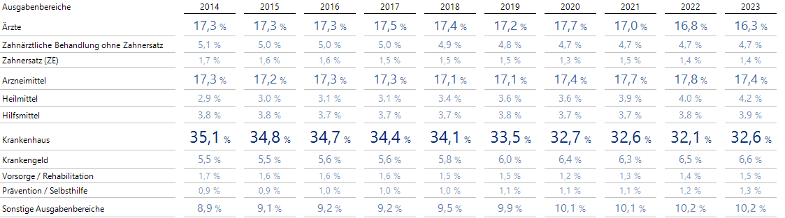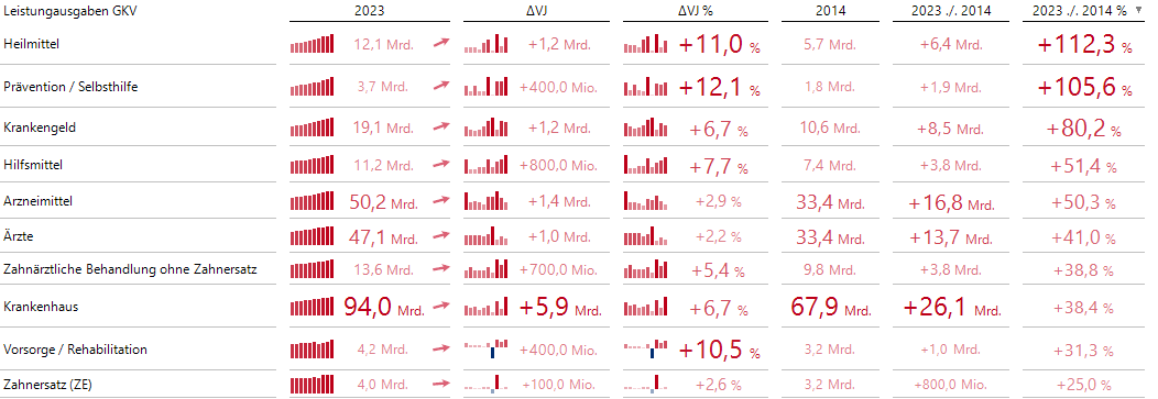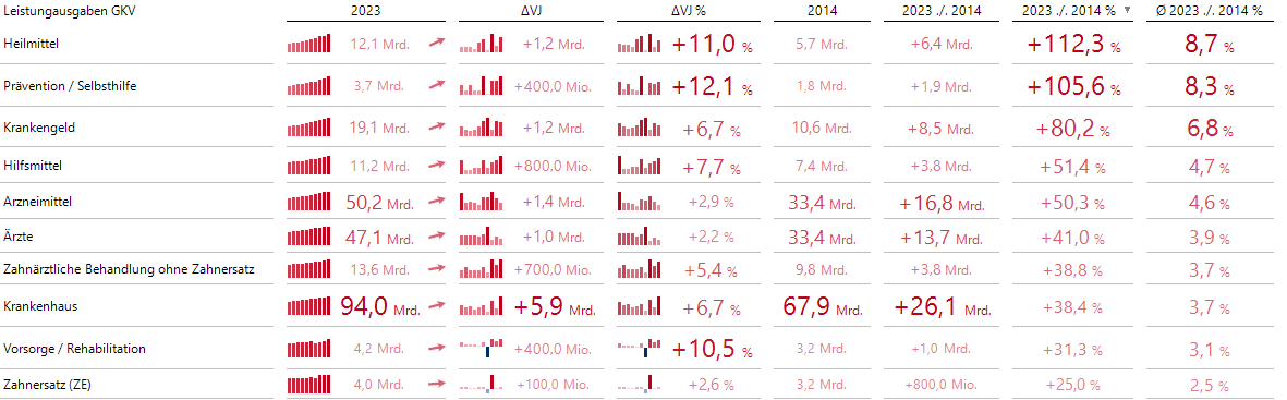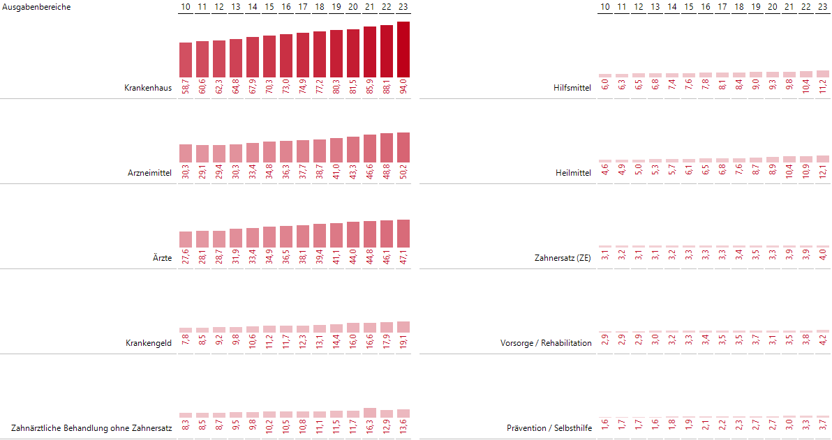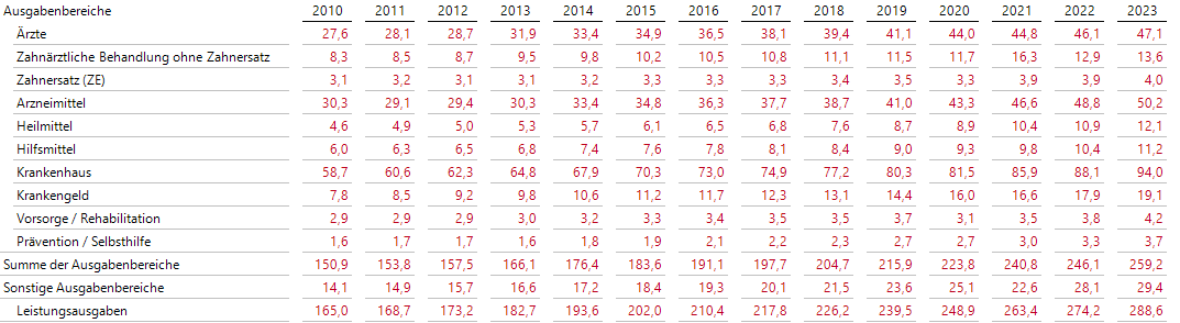 Beim Bundesgesundheitsministerium finde ich recht aktuelle Pressemitteilungen mit vorläufigen Zahlen von 2024 im PDF-Format, aber nur mit bereits zusammengefassten Tendenzen. Deshalb habe ich mich auf eine einfache Tabelle beschränkt, die ich beim Verband der Ersatzkassen entdeckt habe. Unter dem Unterpunkt „GKV – Leistungsausgaben“ gibt es Daten von 2010 bis 2023, einmal unter „Download“ als Bild und einmal als Tabelle, deren Inhalt kopiert werden kann.