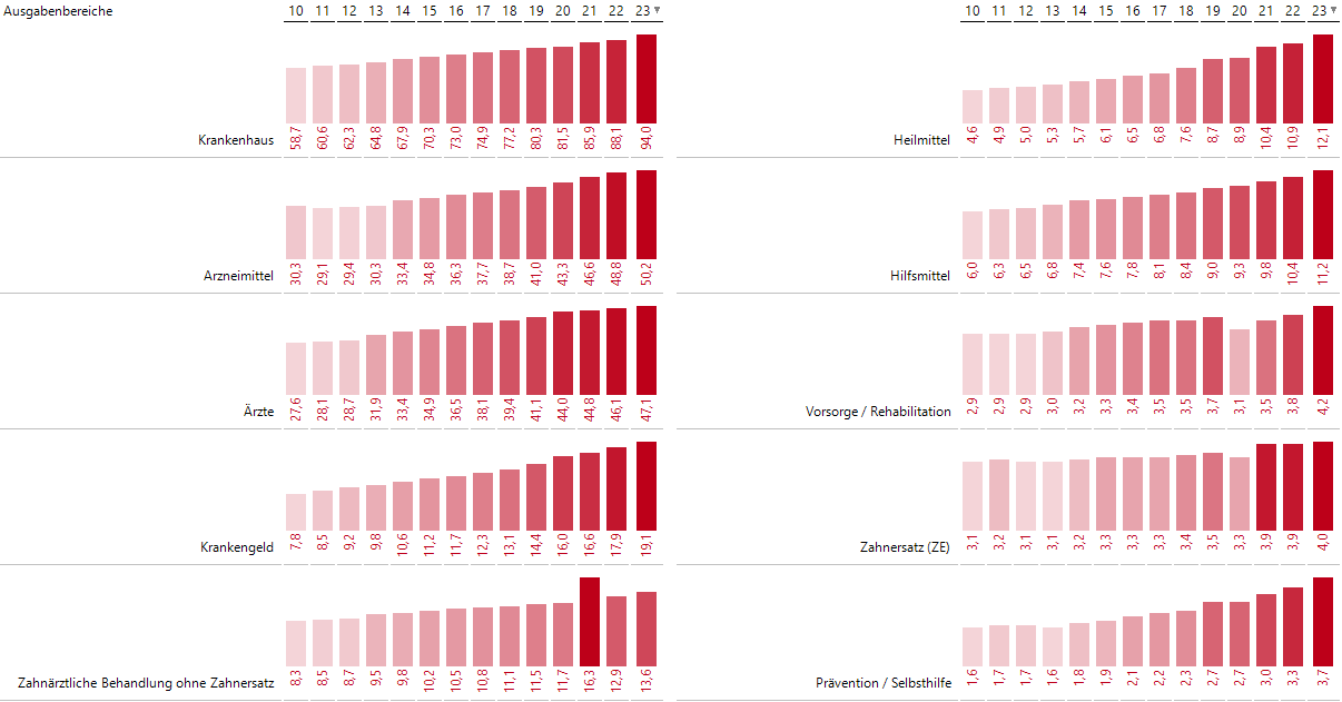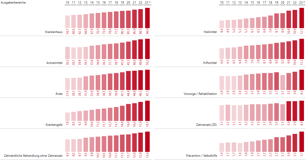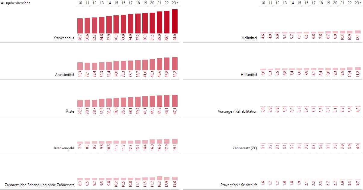 Sofort wird deutlich, dass bei den Ausgaben die Krankenhäuser führen, gefolgt von einem Zweier-Feld, bestehend aus Arzneimitteln und Ärzten. Auch in den wachsenden Zifferngrößen im Verlauf der Zeit von links nach rechts ist zu spüren, dass es bei den Ausgaben im Allgemeinen nur eine Richtung gibt: die nach oben!