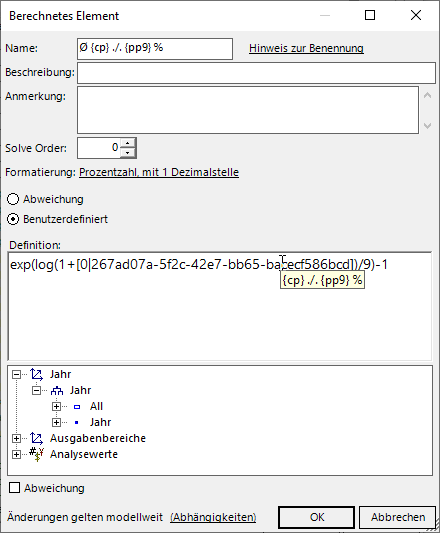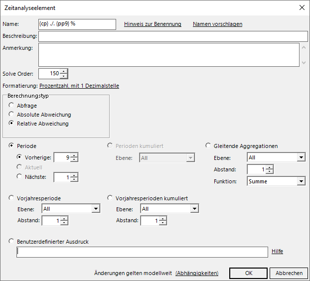 Dazu legen wir zunächst ein Zeitanalyseelement für die relative Abweichung des aktuellen Jahres zum Jahr 9 Jahre vorher an: