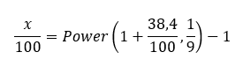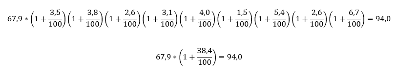 Aufgrund des Zinseszinseffekts ergeben sich die 38,4 % nicht einfach als Summe der 9 Prozentzahlen 3,5 %, 3,8 %, …, 6,7 %. Es gilt vielmehr folgender Zusammenhang (erste Zeile, Darstellung mit 1 Nachkommastelle):