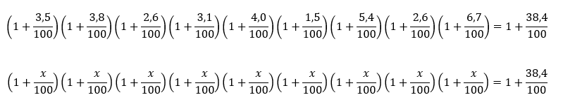 Wir suchen nun eine gleichbleibende Steigerungsrate x/100, die die Gleichung der zweiten Zeile erfüllen muss.