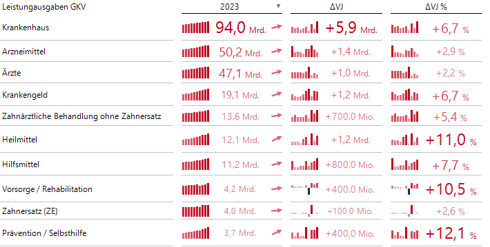 Es lässt sich leicht ablesen, dass zum Beispiel Krankenhausausgaben im Jahr 2021 geringer wuchsen als die Gesamt-Leistungsausgaben, da der entsprechende grüne Dot von Krankenhaus tiefer liegt.