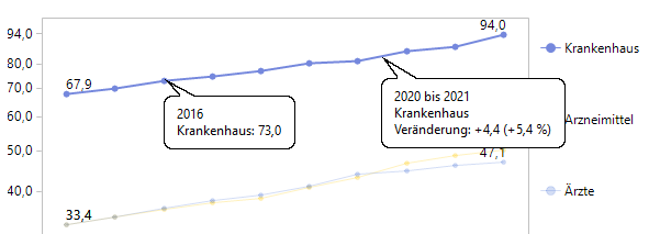 Wir sehen nun mehr als deutlich, wie sich im Beispiel die Krankenhauskosten von 67,9 Mrd. mit jährlichen Steigerungsraten zwischen 1 % und zuletzt fast 7 % auf die 94,0 Mrd. erhöht haben.