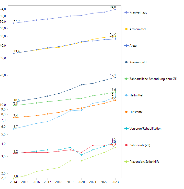 Im Großen und Ganzen sieht man ein mehr oder weniger monotones Wachstum. In den ersten vier Jahren weisen aber einige der Ausgabenbereiche stabile Ausgaben auf, wie zum Beispiel Arzneimittel oder Vorsorge/Rehabilitation. Bei Vorsorge/Rehabilitation gab es 2020 wegen der Corona-Pandemie einen erklärbaren Einbruch. In leichterer Form ist dies auch beim Zahnersatz sichtbar.