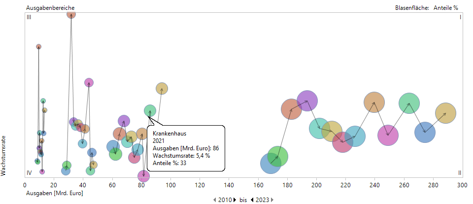Auch die dynamische Portfolioanalyse eignet sich für eine interaktive Auswertung. In der Analyse stellen wir beispeilsweise die Wachstumsrate den Ausgaben gegenüber. Die Blasenfläche steht stellvertretend für den Anteil an den Gesamtausgaben. Wir sehen die Entwicklung der Jahre von 2010 bis 2023. Die Färbung folgt hier aufgrund des Jahres: Gleiche Jahre erhalten jeweils die gleiche Farbe.
