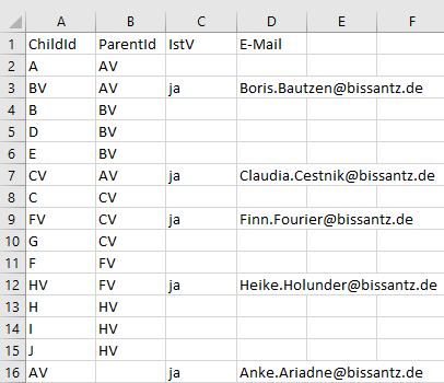 Weiterhin haben wir eine Spalte „IstV“ angelegt, die auf „ja“ steht, falls es sich bei einem Element um einen Verantwortungsbereich handelt. Außerdem existiert eine E-Mail-Adresse der verantwortlichen Person der Abteilung. Alle Namen sind frei erfunden und Übereinstimmungen mit real existierenden Personen wären rein zufällig. Die E-Mail-Adressen laufen somit ins Leere!