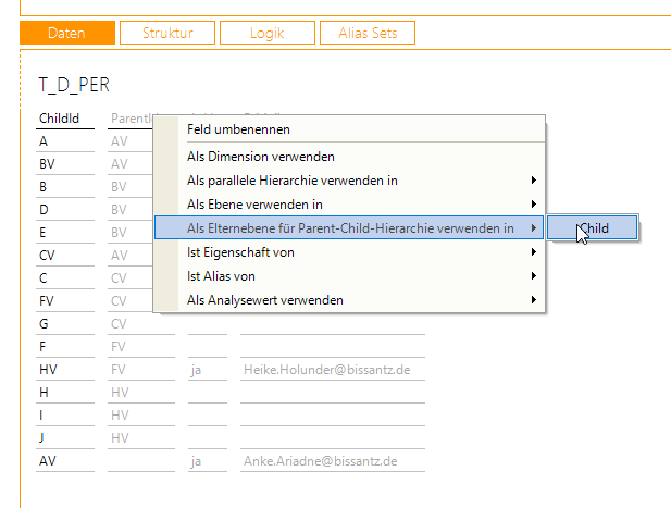Für die Parent-Child-Hierarchie im Selfservice benötigen wir zwingend exakt zwei Spalten – die der Kinder und die ihrer Eltern. Übrigens ist der Ausdruck Eltern in der deutschen Sprache leicht irreführend, da es immer nur einen Elternknoten gibt. Das passende Gegenstück zu „Parent“ wäre „Elternteil“, aber das hört sich dann doch sehr sperrig an.