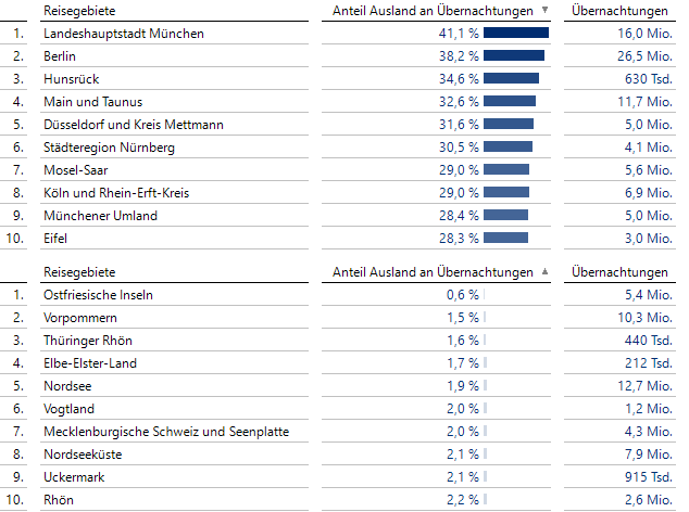 Etwa 2 von 5 Übernachtungen erfolgen in München oder Berlin durch ausländische Gäste. Auch der Hunsrück ist weit oben vertreten. Auf den Ostfriesischen Inseln oder in Vorpommern trifft man hingegen fast ausschließlich deutsche Gäste an.