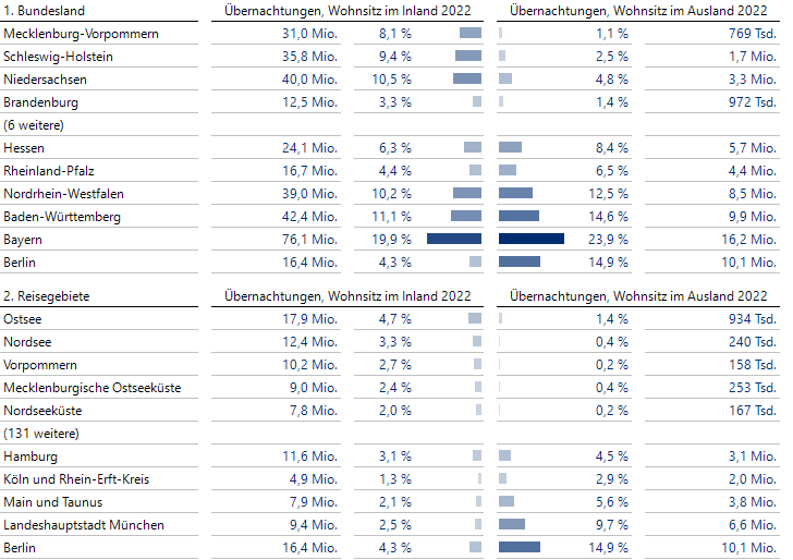 Auf der kleinteiligeren Ebene der Reisegebiete sind Ost- und Nordsee die Lieblinge der Deutschen, und wieder Berlin und auch München kommen bei ausländischen Gästen überproportional gut an.