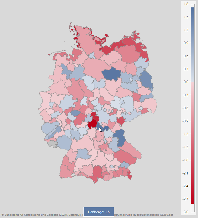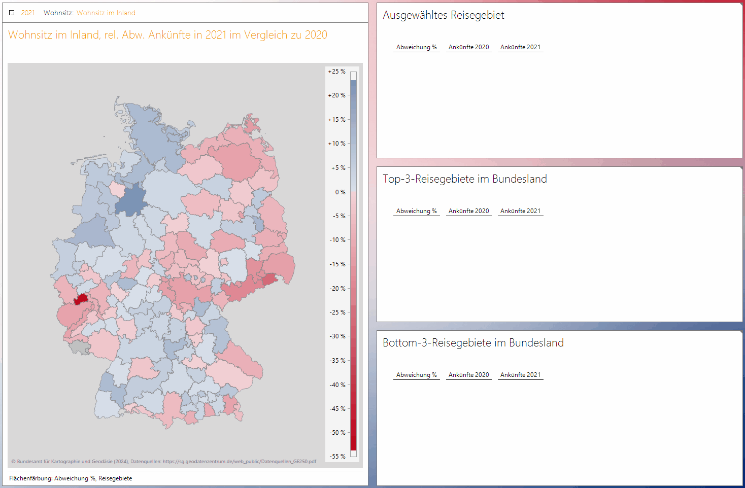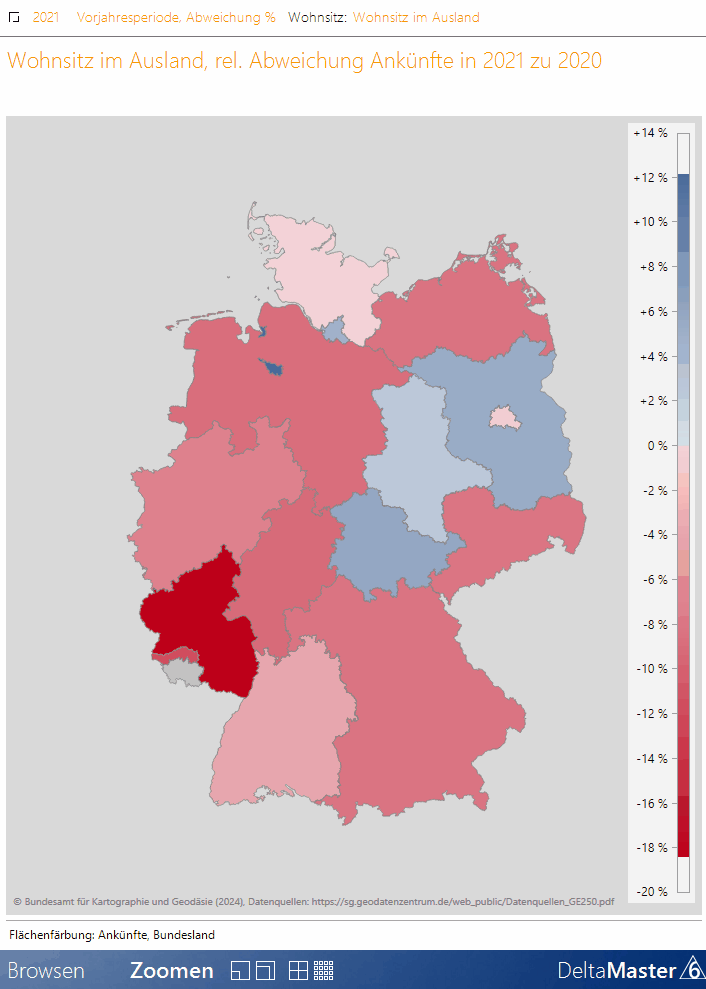 Drillen wir in ein Bundesland, passt DeltaMaster die Skala an die Werte nur dieses Bundeslandes an. Dadurch können die Unterschiede der Reisegebiete besser beurteilt werden. Dieser Effekt der Skala-Anpassung ist am deutlichsten sichtbar, wenn sich die Werte der Bundesländer stark unterscheiden, die Werte der Regionen innerhalb eines Bundeslandes aber weniger.