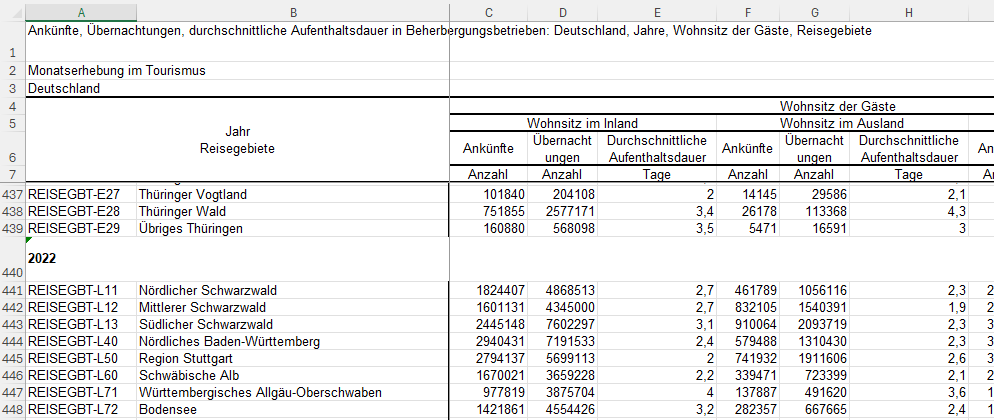 Der Datensatz 45412-0009 beinhaltet Daten zu den Jahren 2019 bis 2022. Er enthält Zahlen zu Ankünften, Übernachtungen und der durchschnittlichen Aufenthaltsdauer in Beherbergungsbetrieben in Deutschland. Dabei wird noch nach dem Wohnsitz der Gäste (Inland oder Ausland) und dem konkreten Reisegebiet differenziert. Für Deutschland existieren 141 Reisegebiete. Ein Beherbergungsbetrieb wird nur dann berücksichtigt, wenn er mindestens 10 Schlafgelegenheiten (bzw. Stellplätze bei Campingplätzen) aufweisen kann.