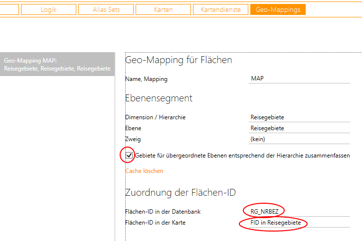 Wichtig ist, dass ich mich hier auf die als Elementeigenschaft definierte Spalte RG_NRBEZ beziehe, die in der Datenbank die Kürzel (L11, XHB, …) enthält. Weiterhin wähle ich die oben definierte Flächen-ID FID aus der Karte Reisegebiete aus. In OLAP-Modellen existiert die Checkbox „Gebiete für übergeordnete Ebenen entsprechend der Hierarchie zusammenfassen“.