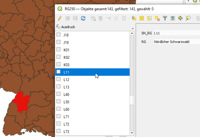 Die Shapefile-Datei mit der Endung DBF, also reisegebiete.dbf, enthält Attribute, die in DeltaMaster genutzt werden können. Sie kann beispielsweise mit Excel angeschaut werden, sofern es die IT nicht durch Sicherheitsrichtlinien untersagt hat, ist aber auch in QGIS sichtbar. Mit Rechtsklick auf RG250 können wir die Attributtabelle einblenden: