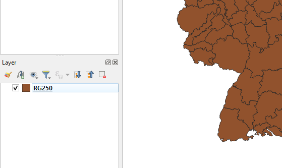 Nach Installation von QGIS wird über den Menüpunkt „Layer/Layer hinzufügen/Vektorlayer hinzufügen“ das zu den Reisegebieten gehörende Shapefile RG250.shp ausgewählt. Dieses erscheint dann in der Layerliste: