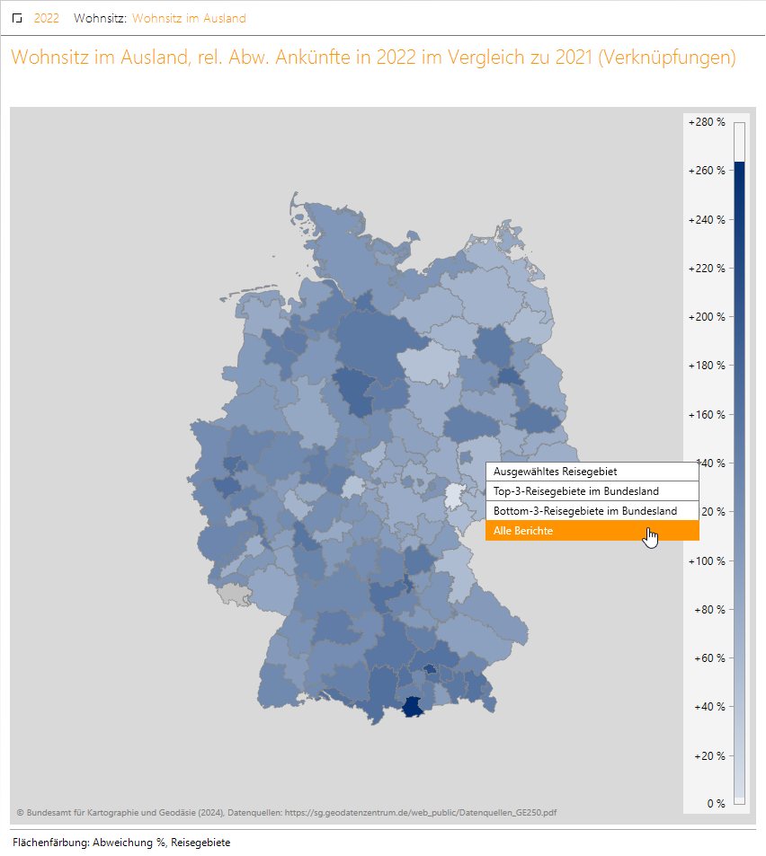 Der obere Bericht auf der rechten Seite zeigt die Entwicklung des ausgewählten Reisegebiets und des zugehörigen Bundeslandes. Die anderen Berichte geben die jeweils drei besten bzw. schlechtesten Entwicklungen im zugehörigen Bundesland an.